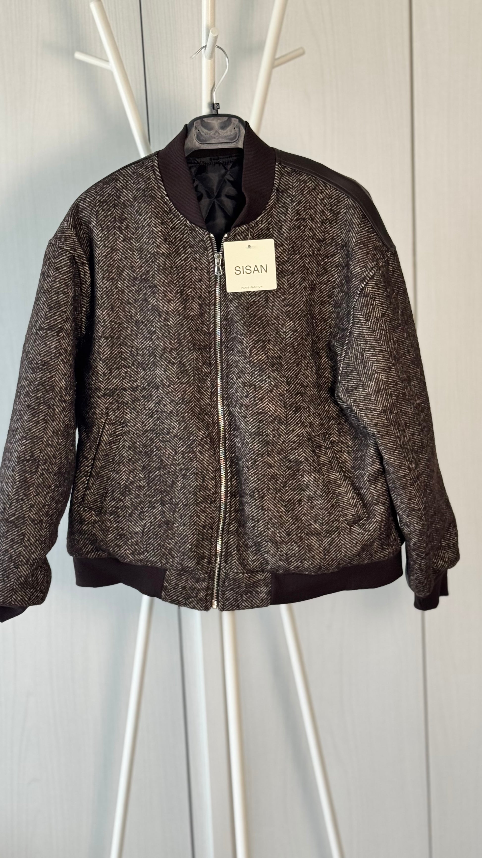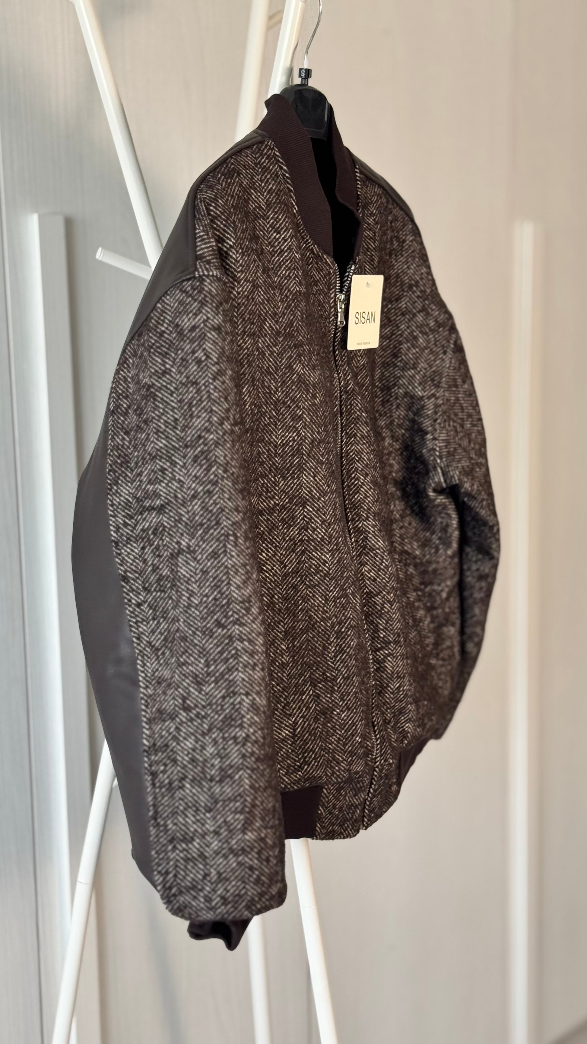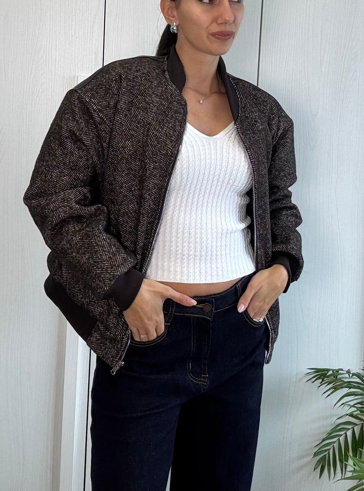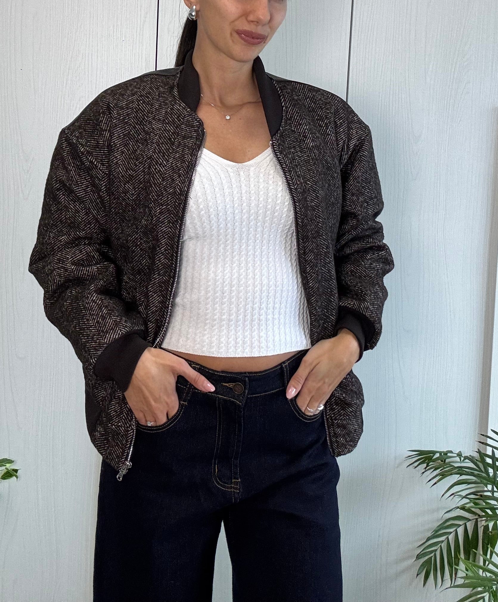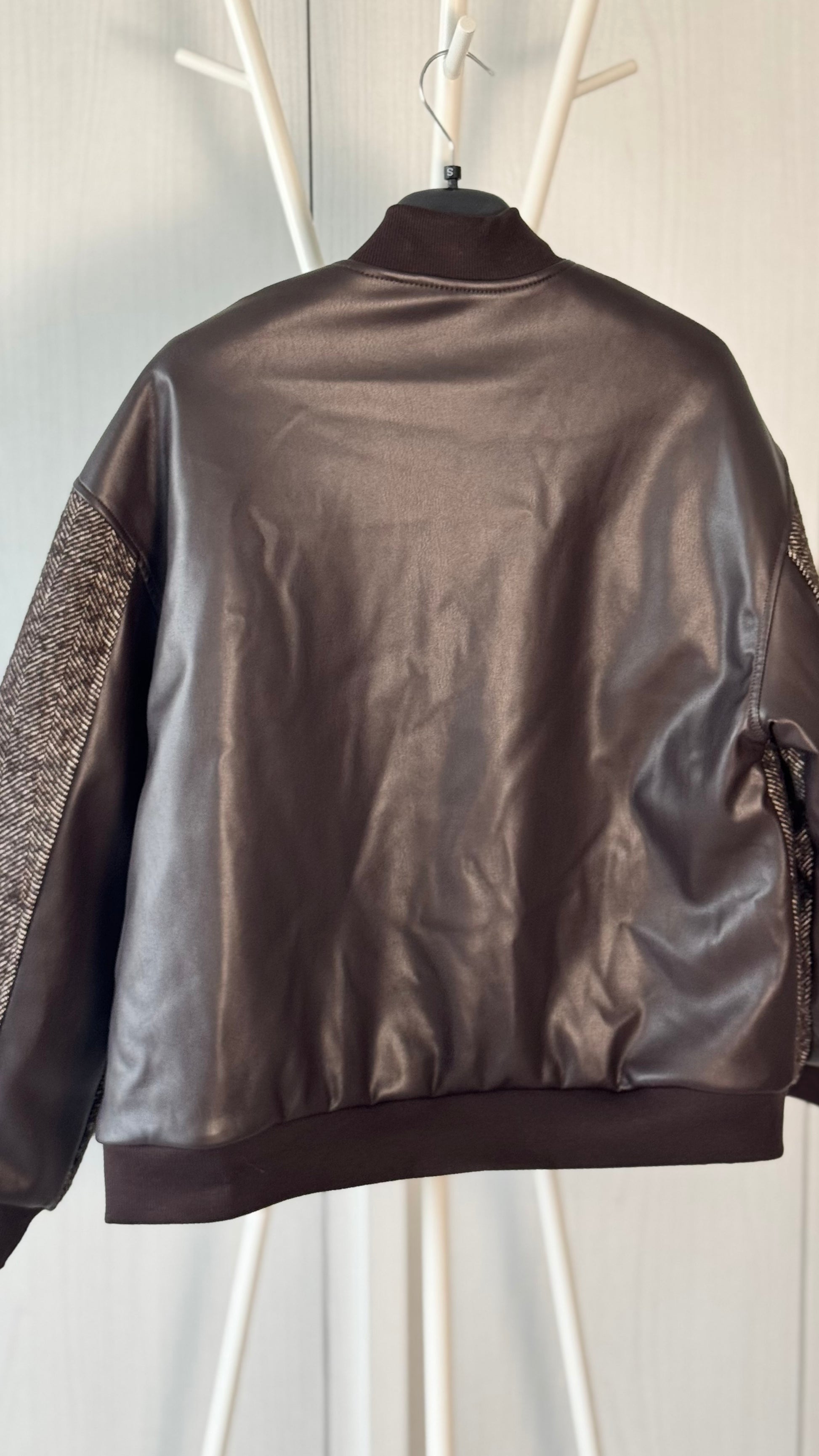 Bomber imbottito dal taglio oversize, realizzato in tessuto spigato color marrone e in ecopelle sul retro. Morbido, caldo e versatile, perfetto per aggiungere un tocco urban-chic ai tuoi look quotidiani.
