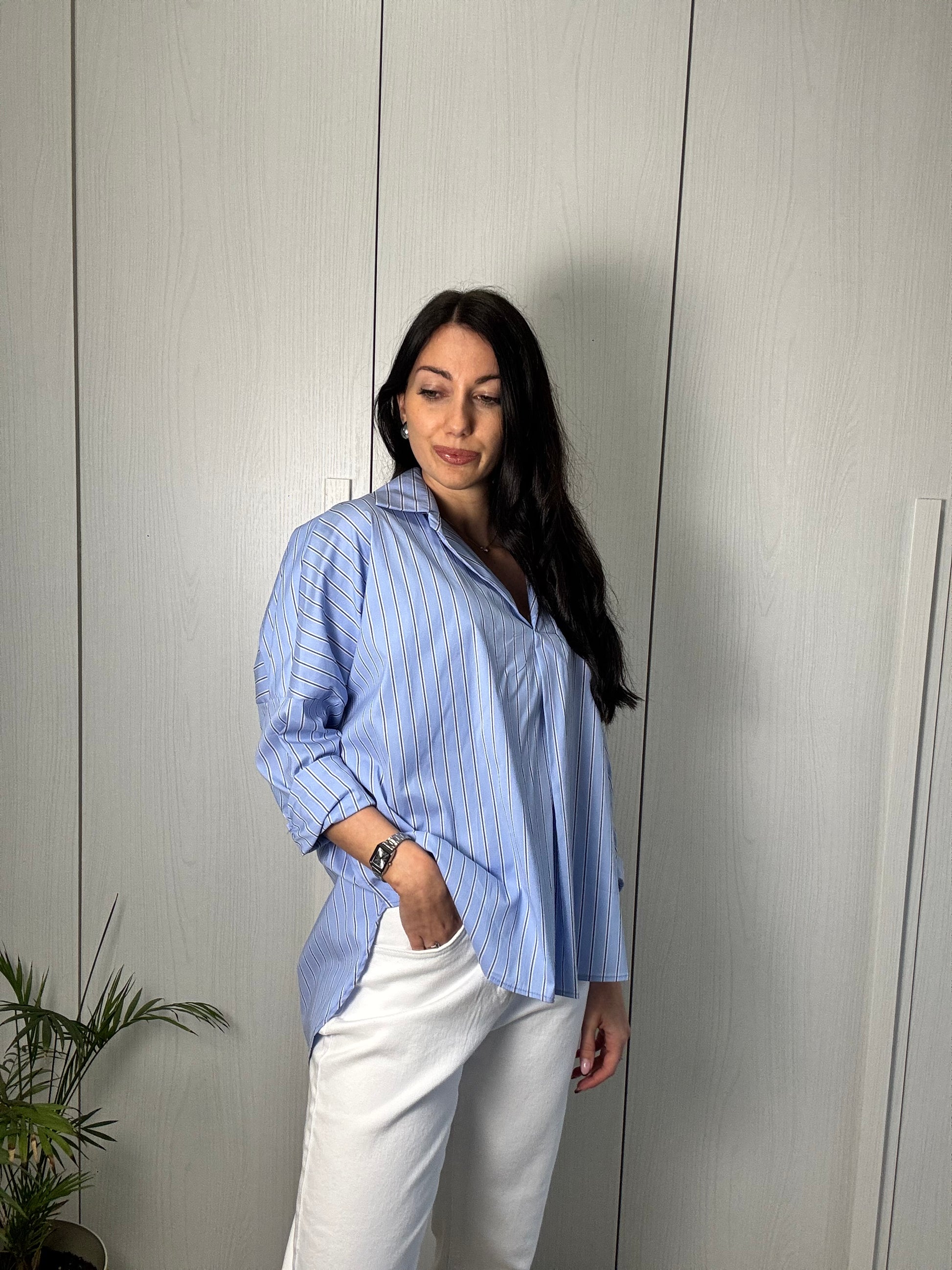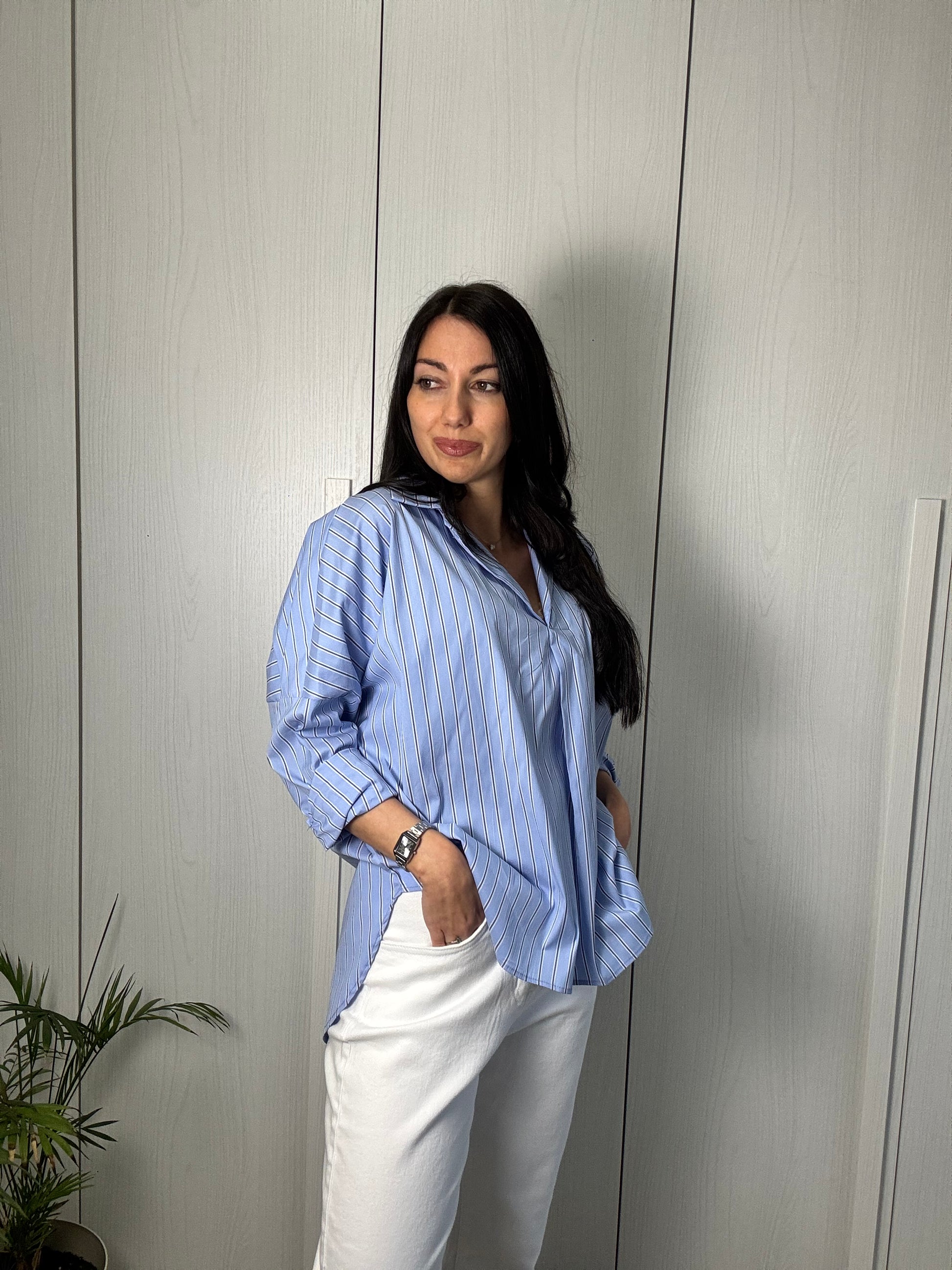 Camicia dal taglio morbido con eleganti righe verticali azzurre su fondo chiaro, perfetta per un look rilassato ma curato. La vestibilità over dona movimento e comfort, mentre il colletto aperto aggiunge un tocco moderno e femminile.