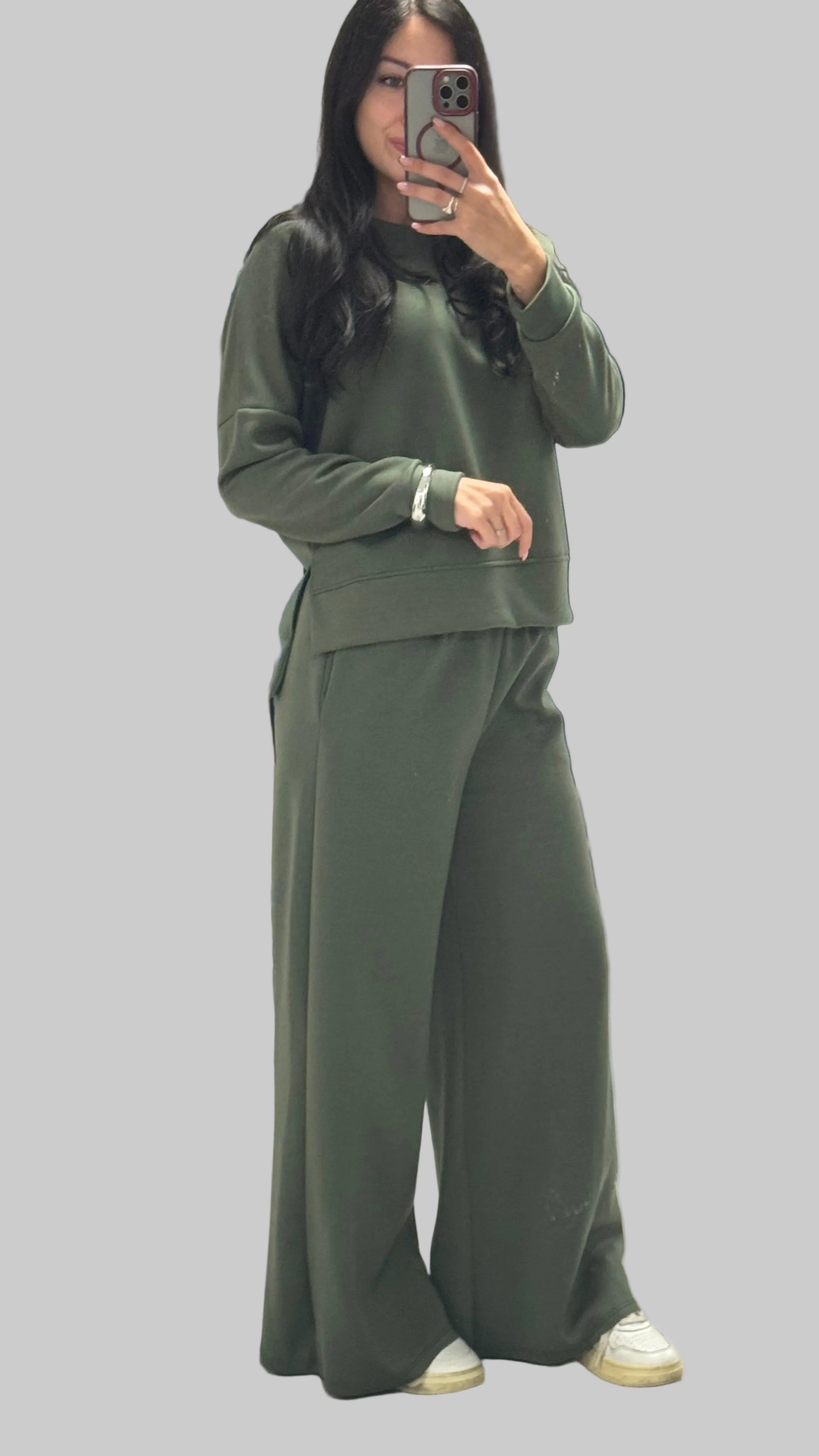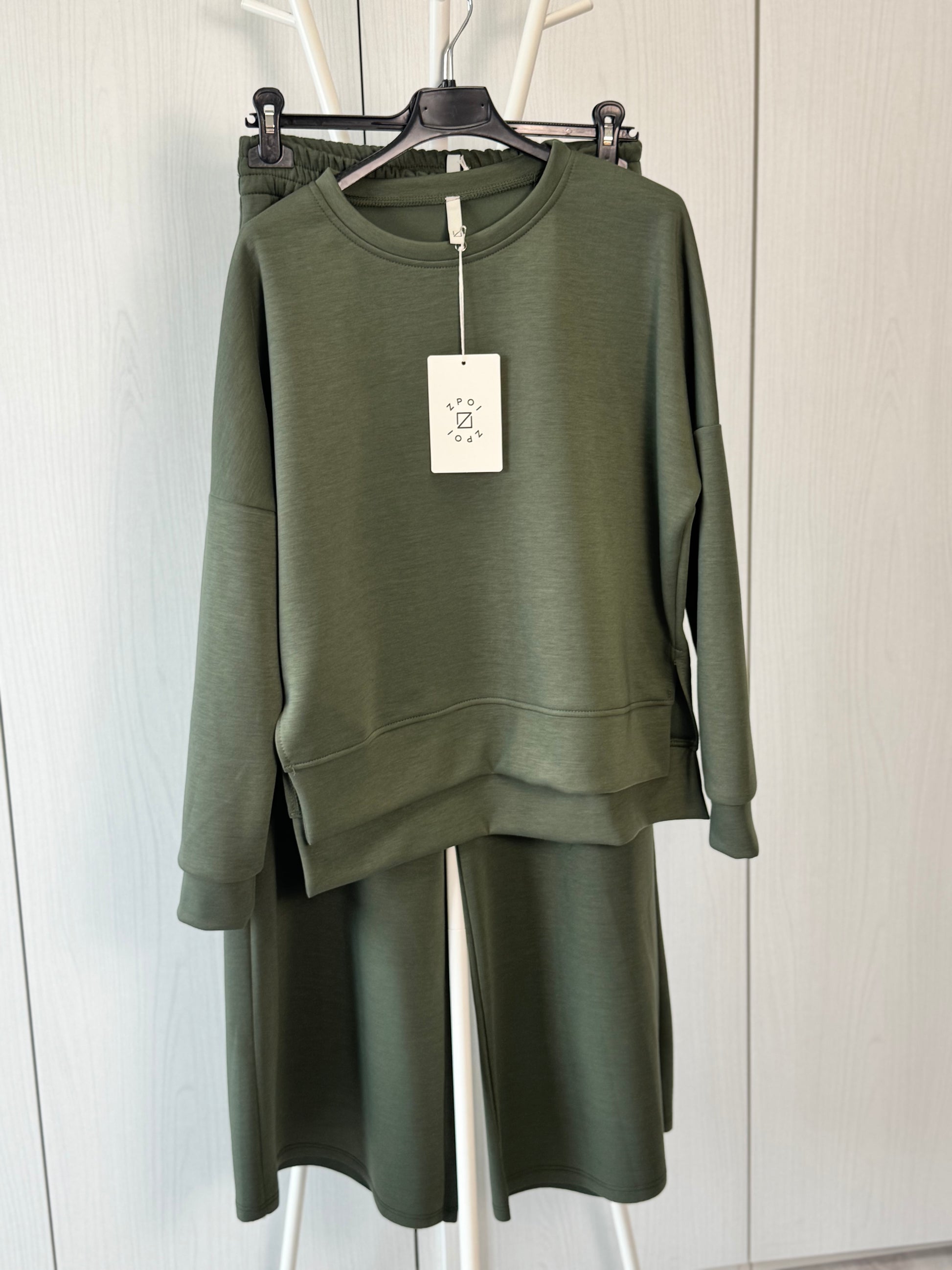 Tuta composta da felpa e pantalone coordinato, realizzata in tessuto morbido e fluido, non felpato, ideale per la mezza stagione.