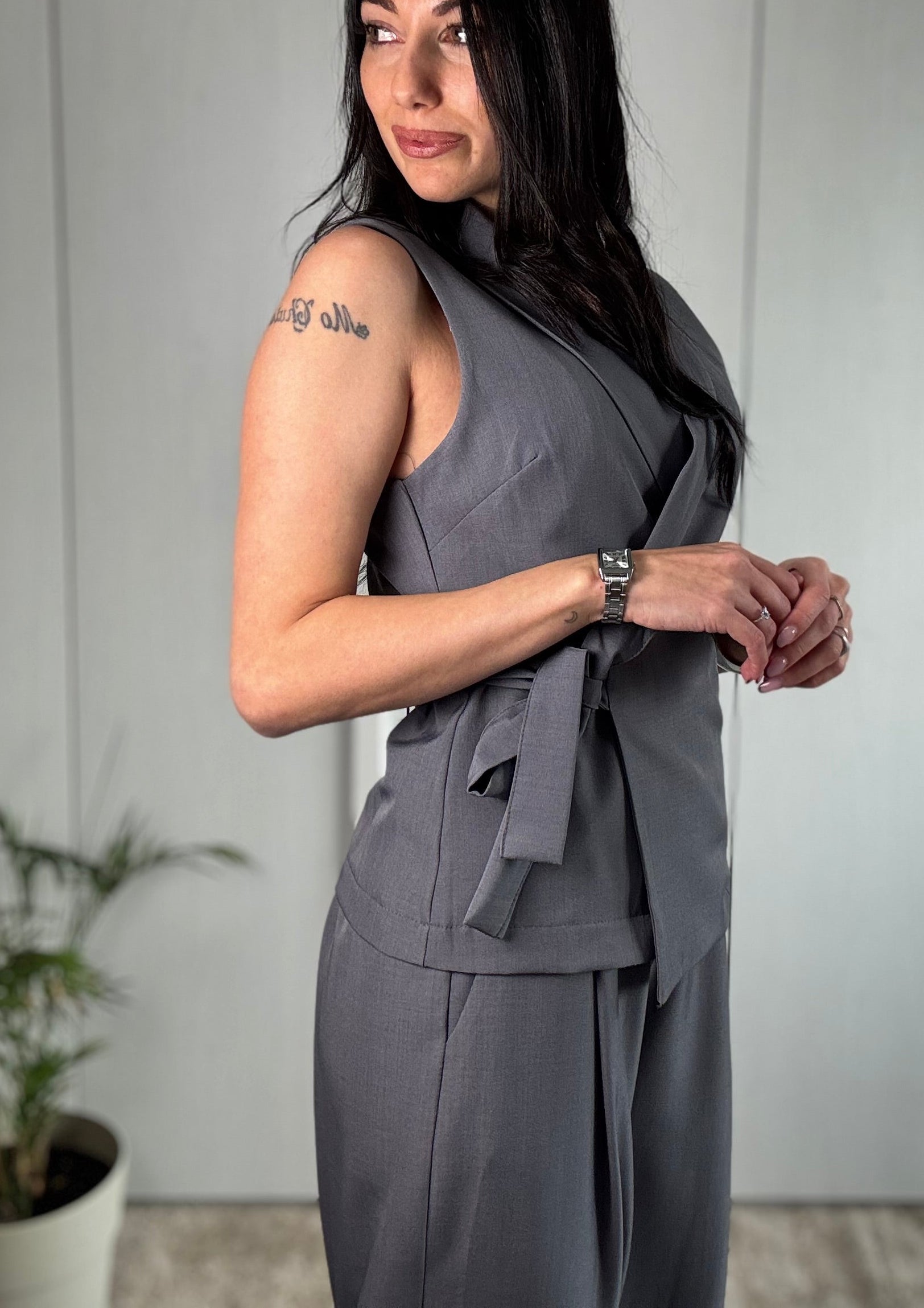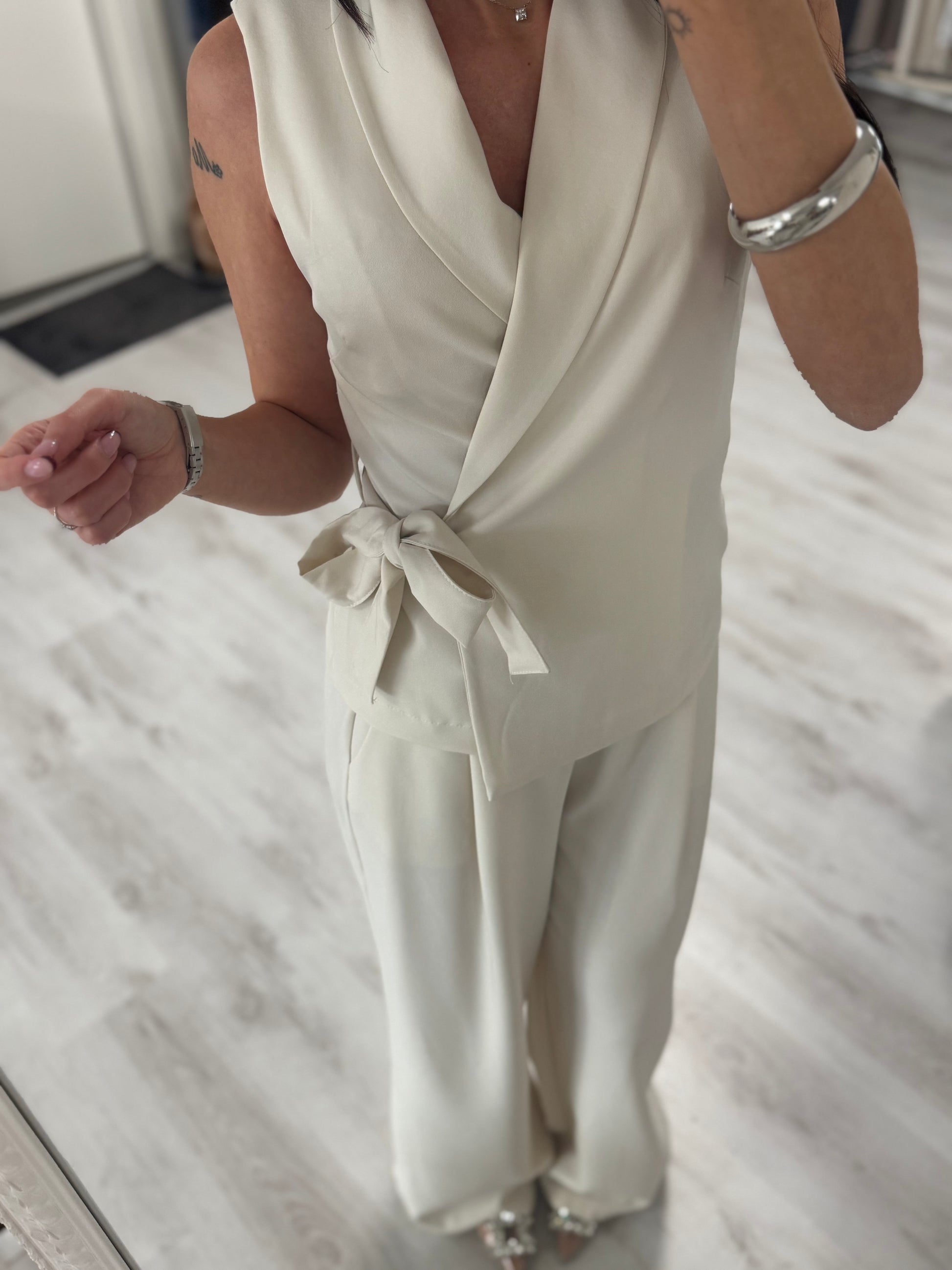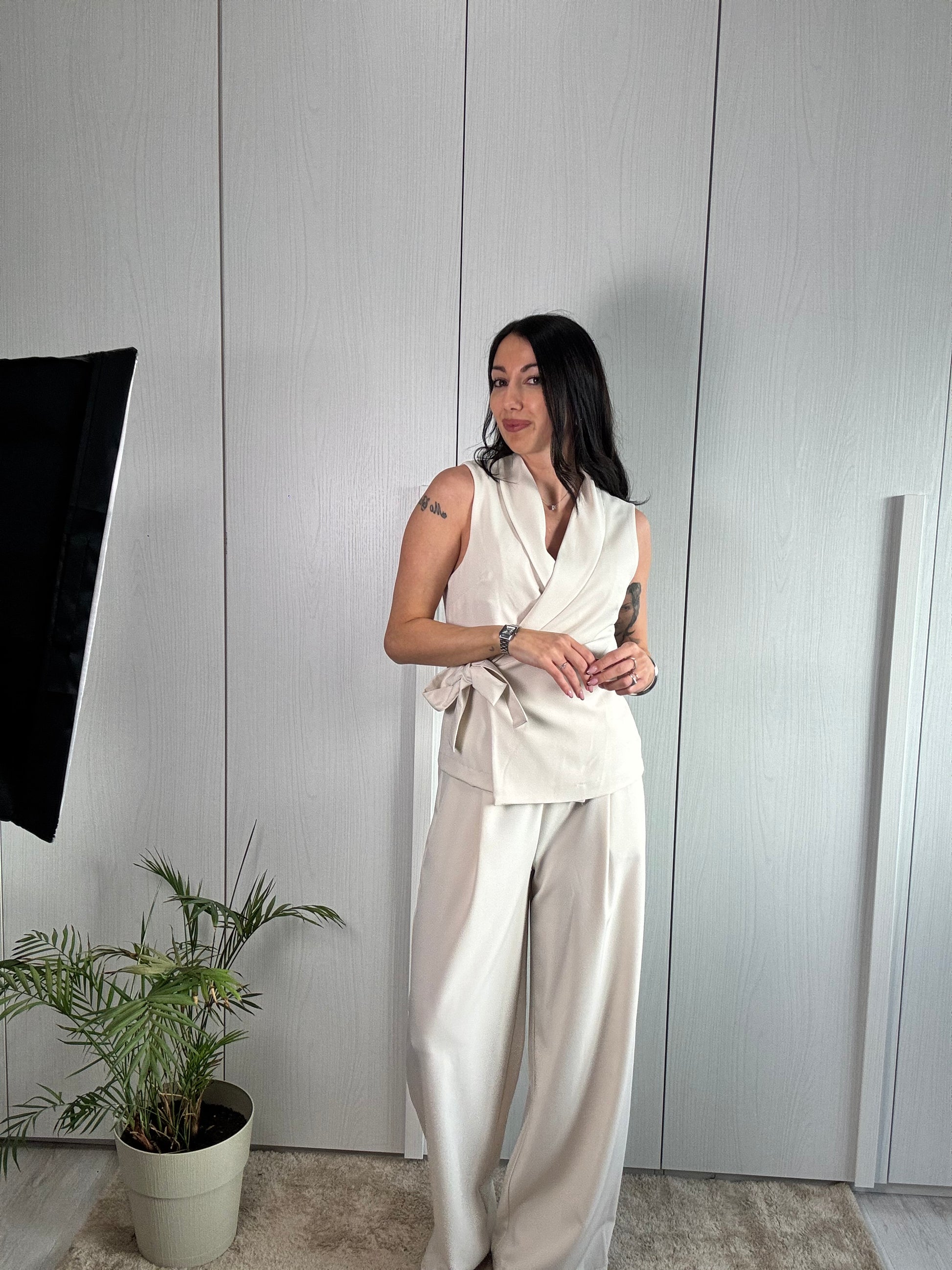 Il gilet con chiusura kimono laterale avvolge la silhouette con naturalezza, mentre il pantalone dal fit fluido è pensato per offrire comfort ed eleganza grazie al bottone frontale e all’elastico sul retro.