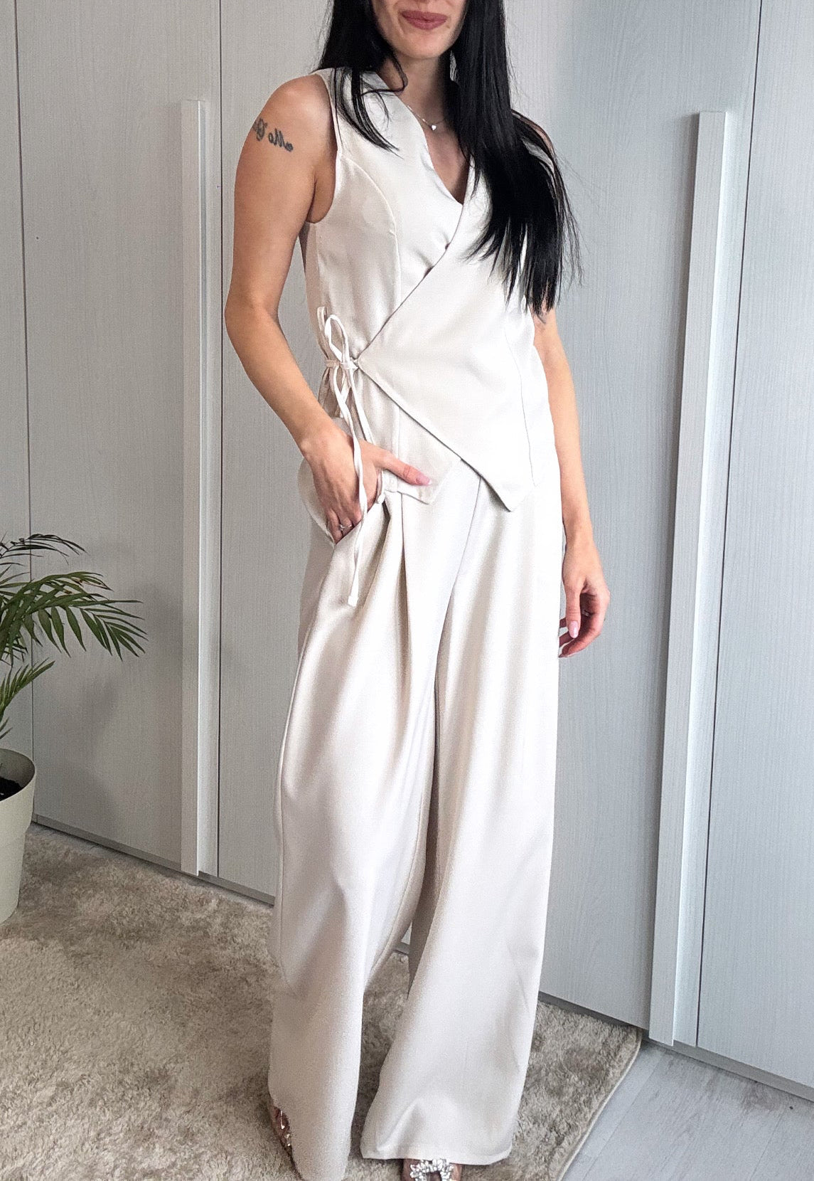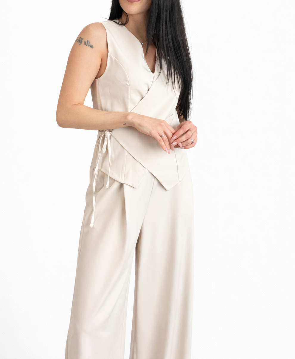 Un completo pensato per valorizzare la silhouette con semplicità ed eleganza. Il gilet con chiusura incrociata dona struttura e carattere al look, mentre il pantalone con elastico in vita assicura comfort e vestibilità impeccabile.