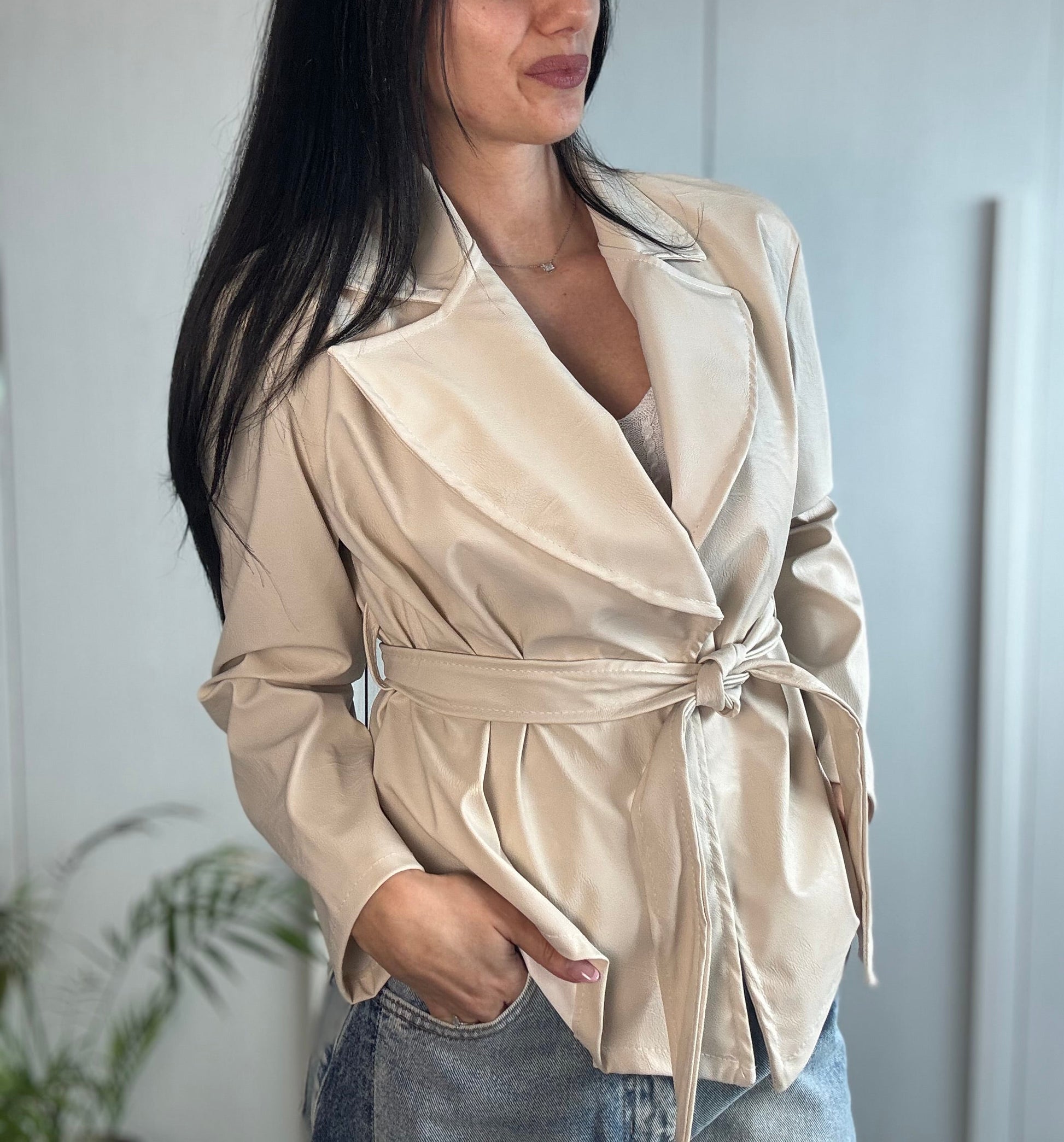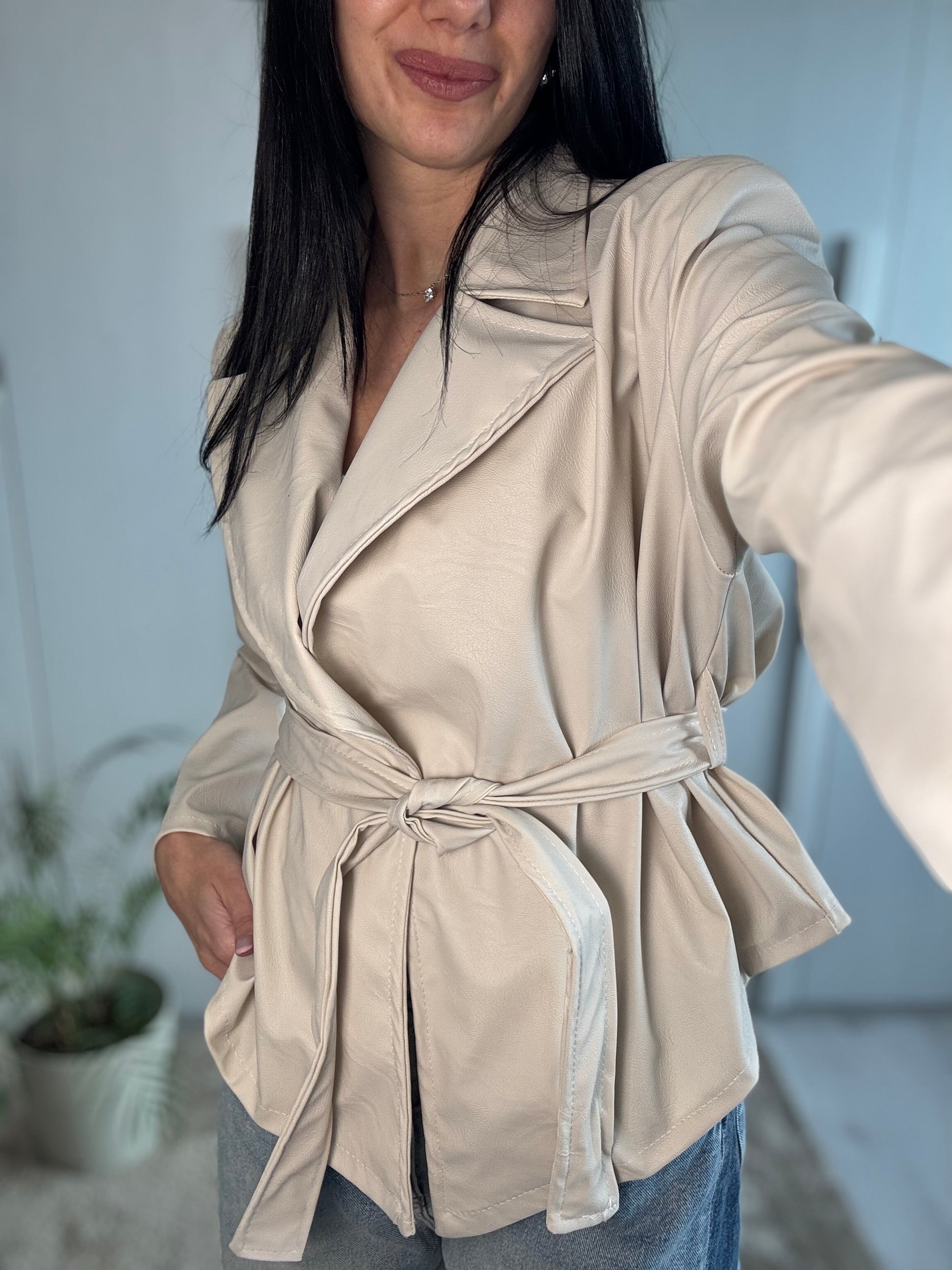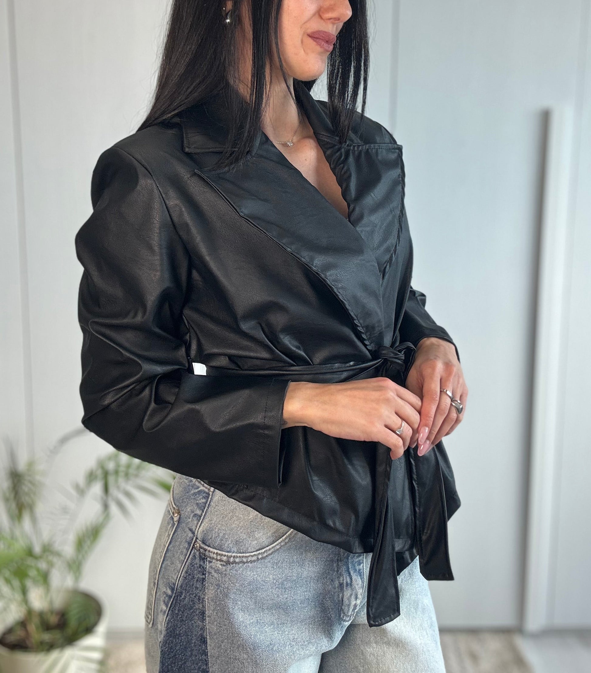 Giacca in ecopelle kimono, caratterizzata da maniche ampie e cintura in vita che valorizza la silhouette. Un capo contemporaneo e versatile, perfetto per completare con carattere ogni look.