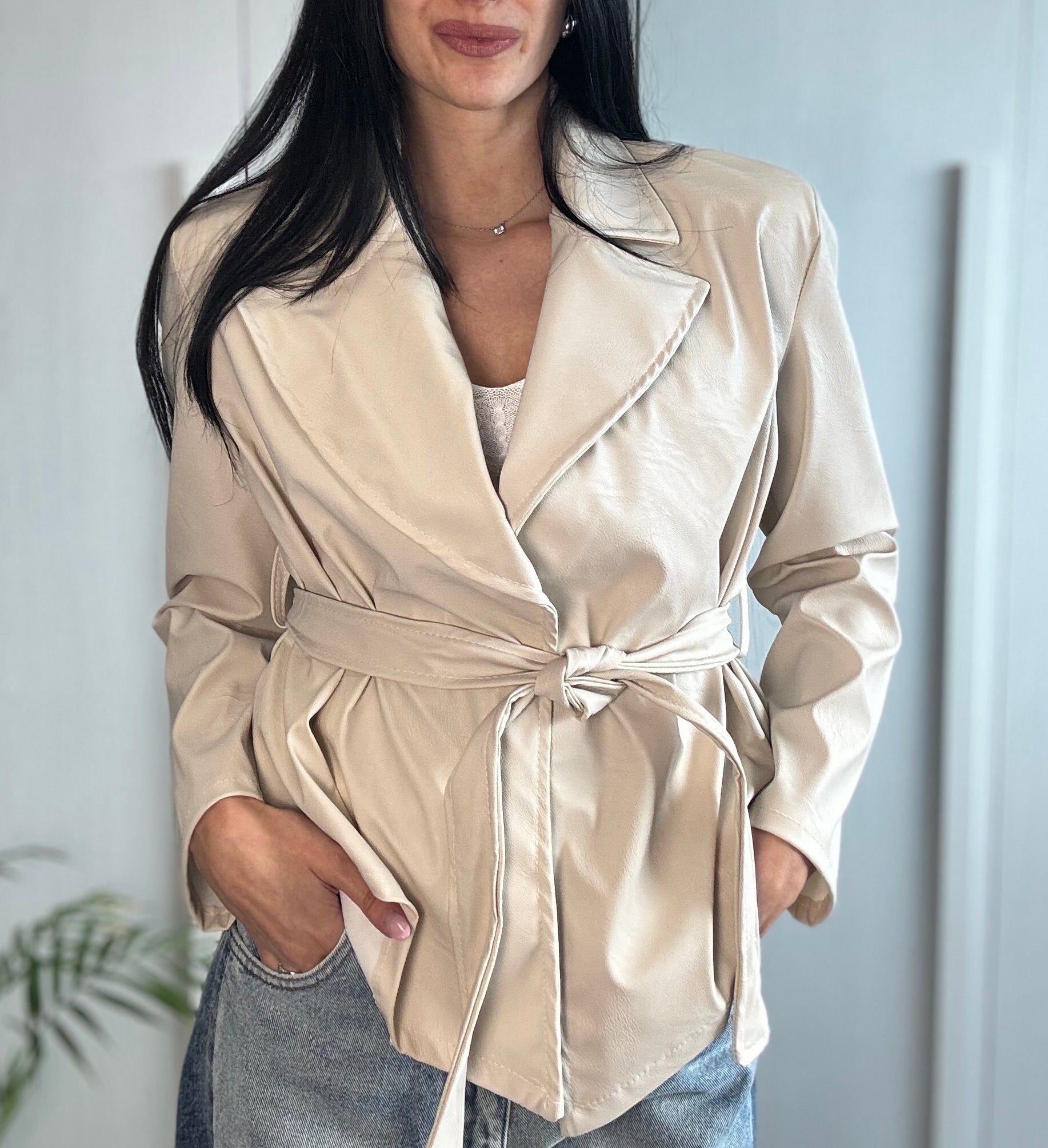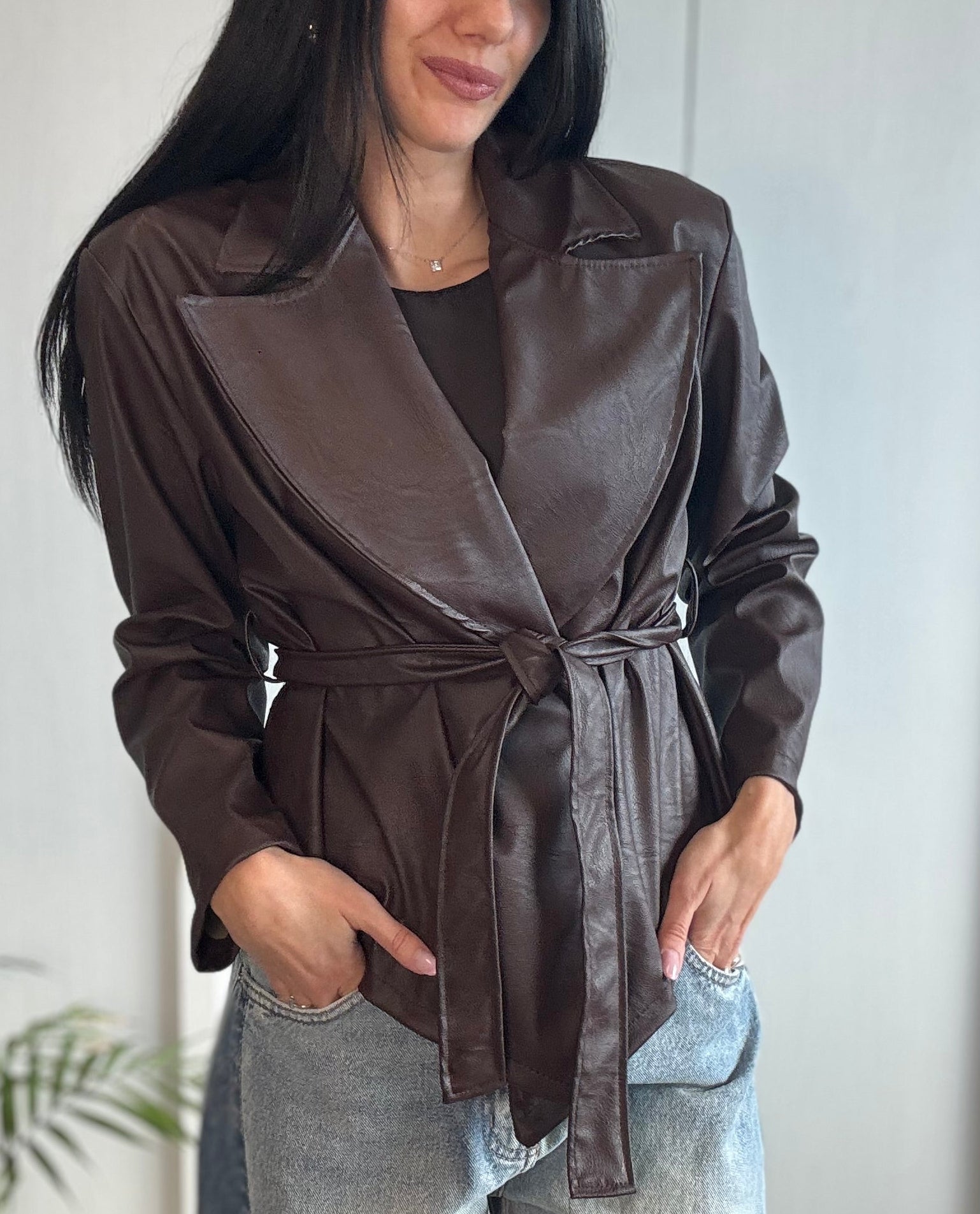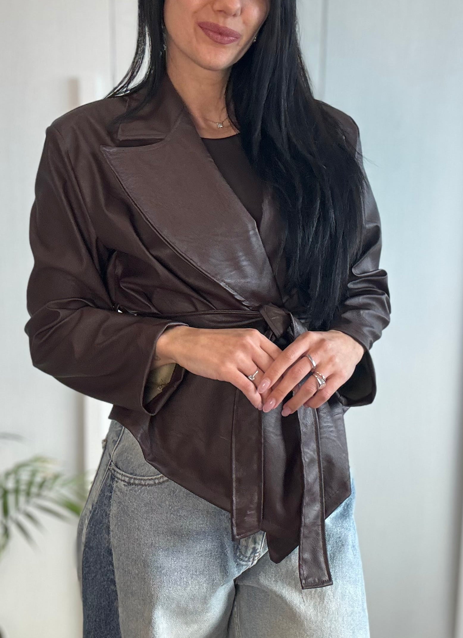 Giacca in ecopelle kimono, caratterizzata da maniche ampie e cintura in vita che valorizza la silhouette. Un capo contemporaneo e versatile, perfetto per completare con carattere ogni look.