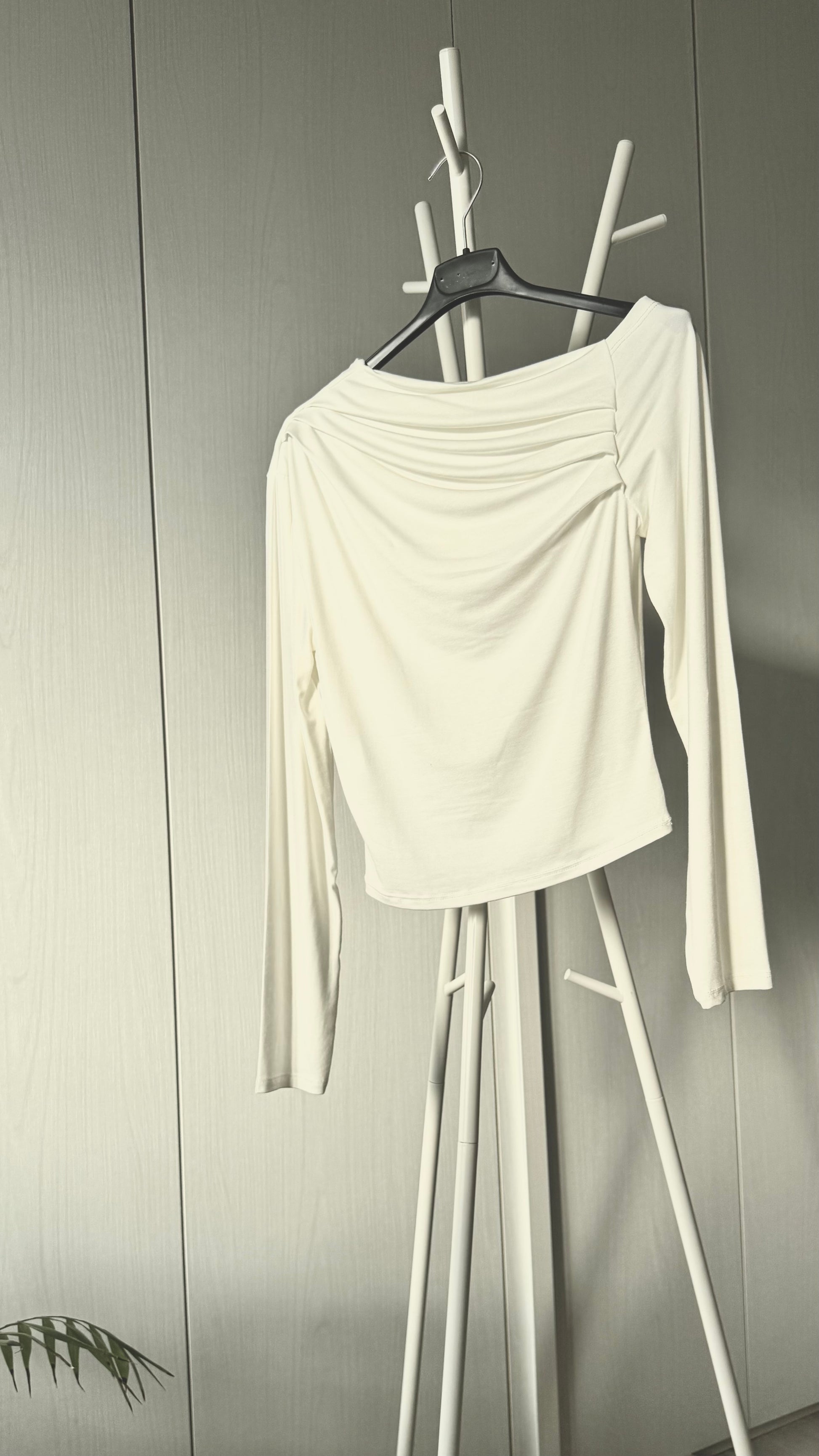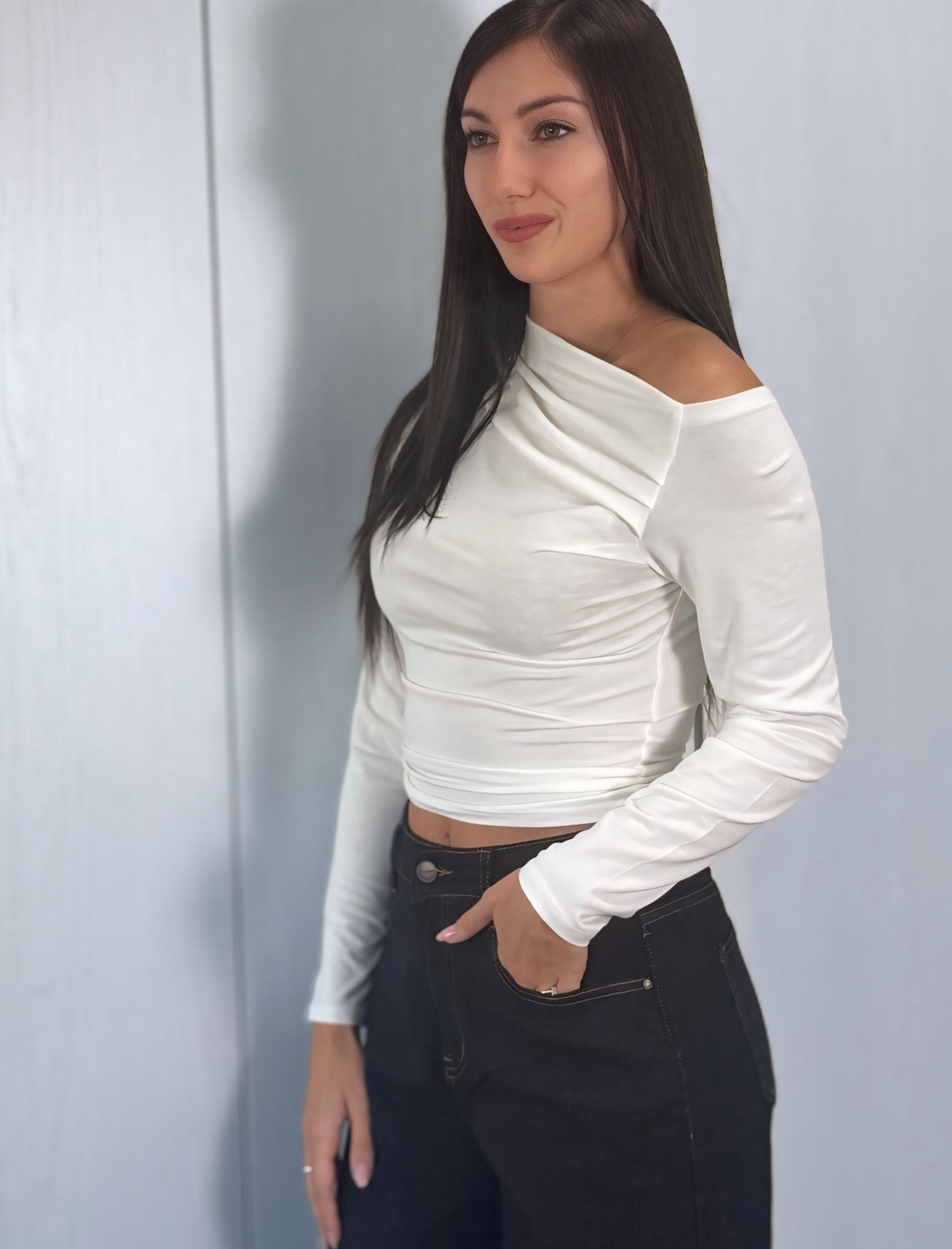 Il dettaglio monospalla con drappeggio delicato dona movimento e sofisticatezza, perfetto per creare look eleganti ma disinvolti.