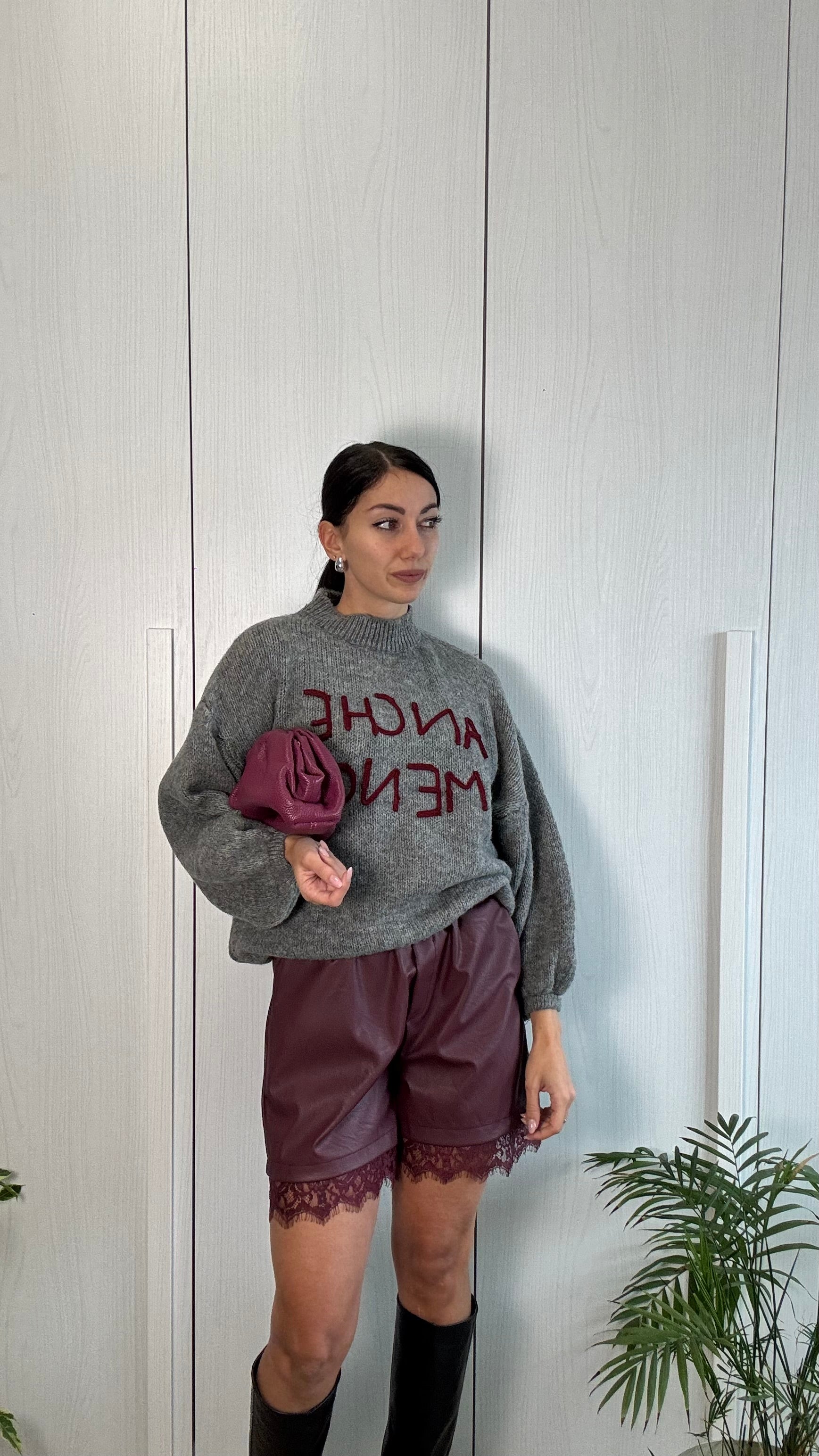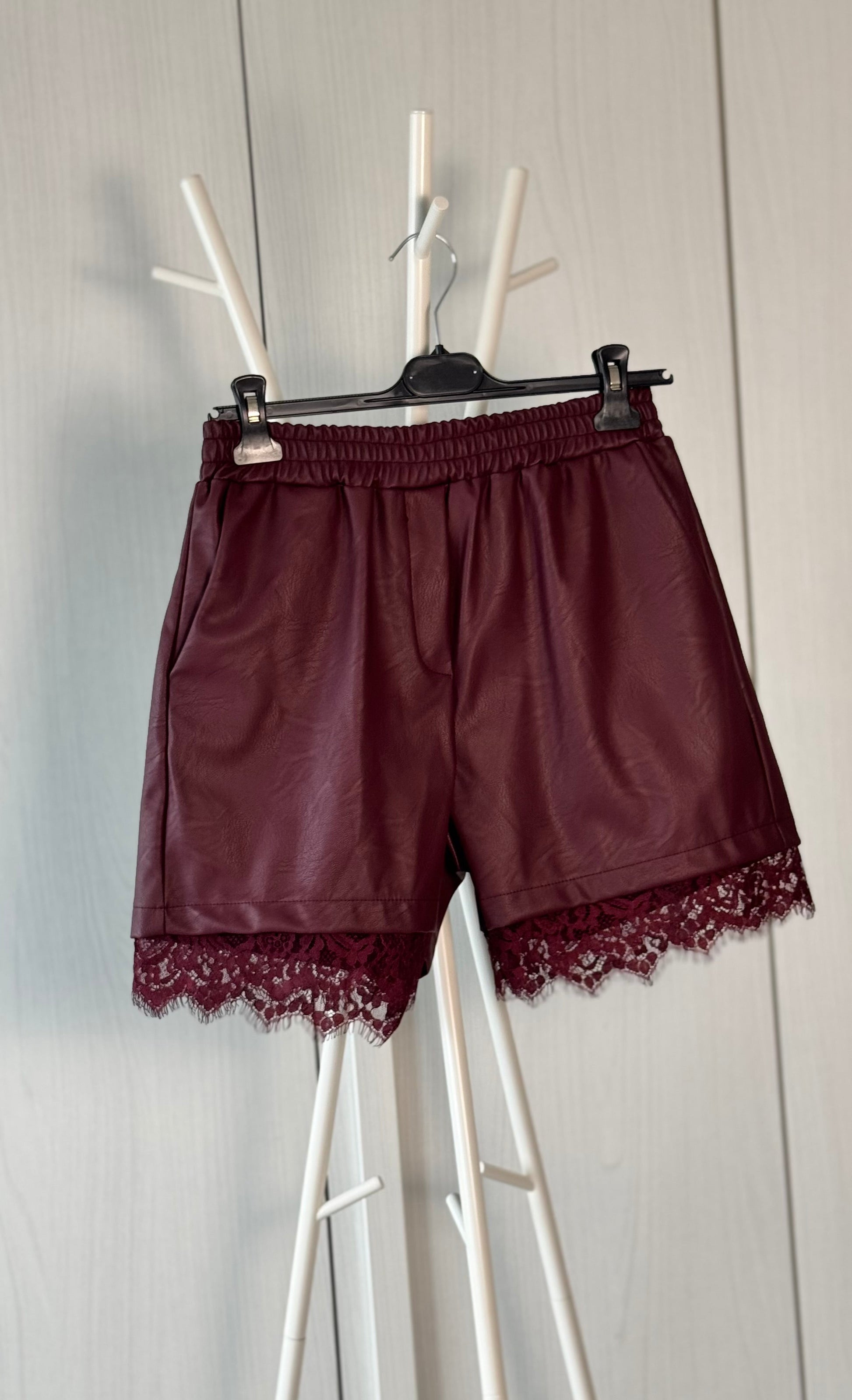 Pantaloncino in morbida ecopelle effetto satinato, impreziosito da un delicato bordo in pizzo tono su tono. Il taglio femminile e la vita elasticizzata lo rendono comodo e raffinato al tempo stesso. Perfetto con maxi maglioni o camicie per un look deciso ma romantico.