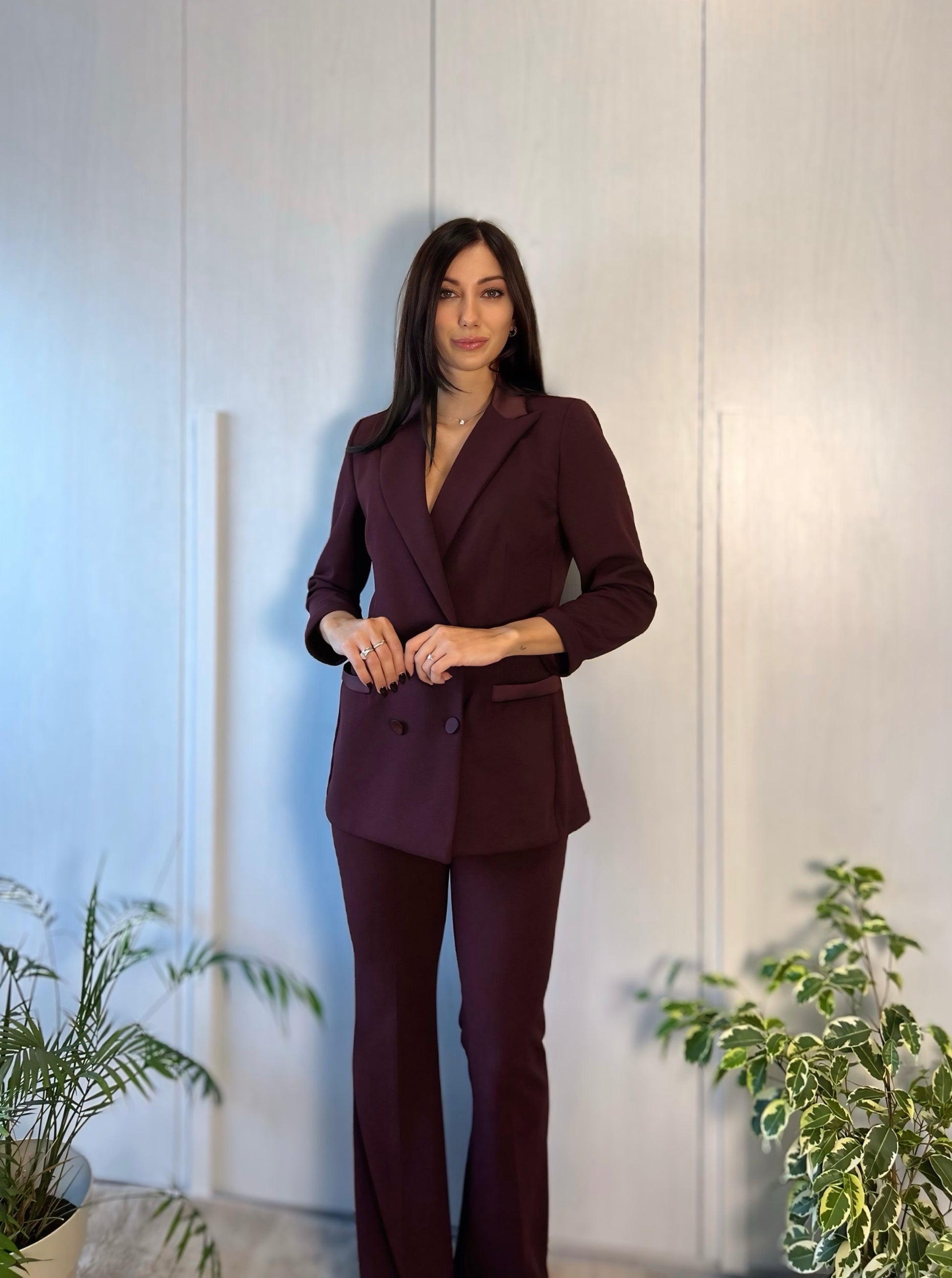 il tailleur JAQUELINE è il completo perfetto per ogni occasione. Composto da un blazer doppiopetto dal taglio sartoriale e pantalone a zampa con zip laterale, slancia la figura ed esalta ogni tipo di fisicità.