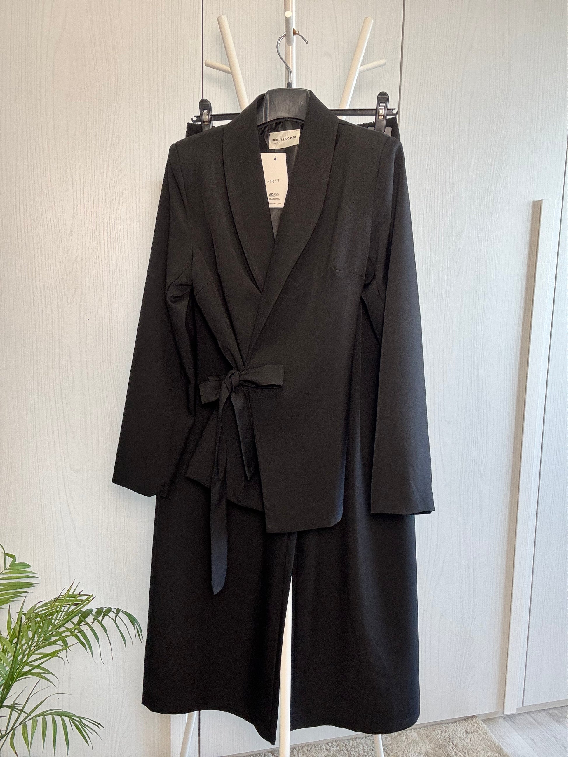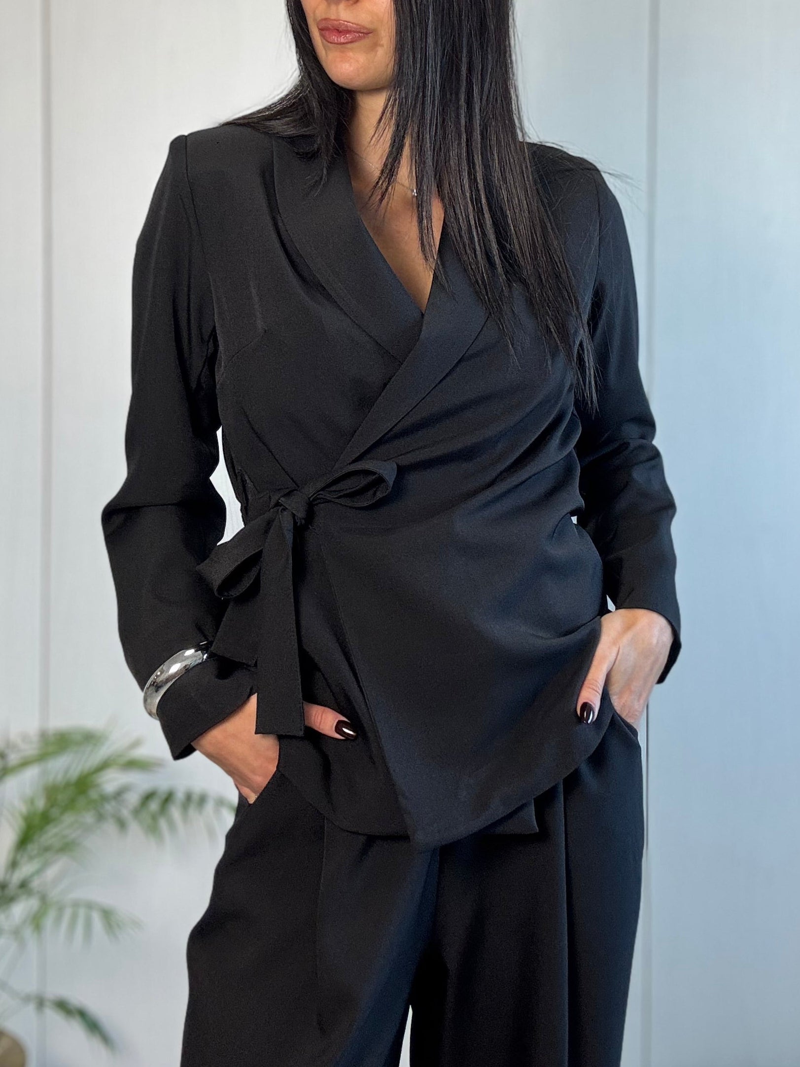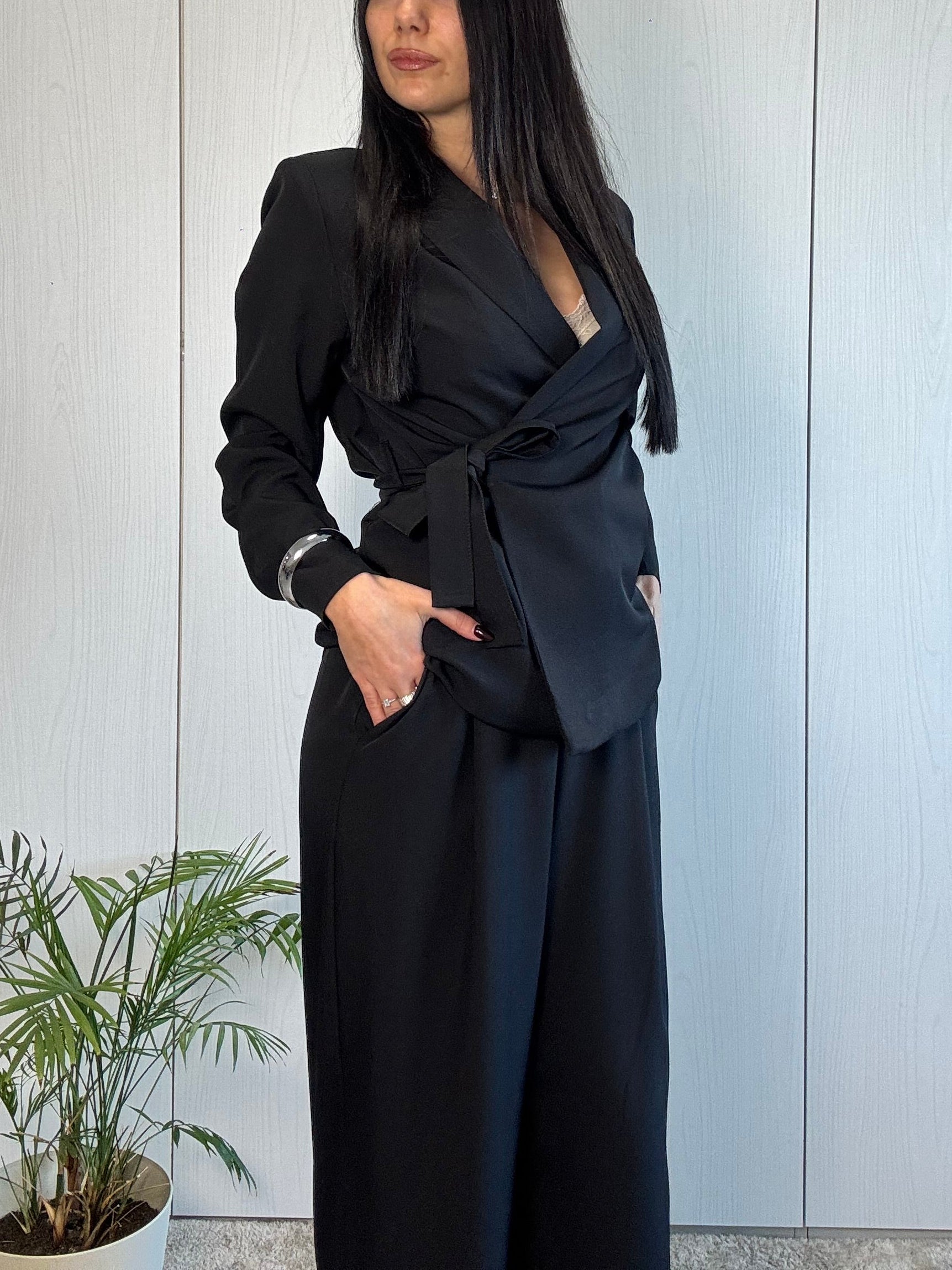 La giacca kimono con chiusura laterale crea una linea armoniosa e femminile, mentre il pantalone morbido assicura una vestibilità fluida e naturale.
