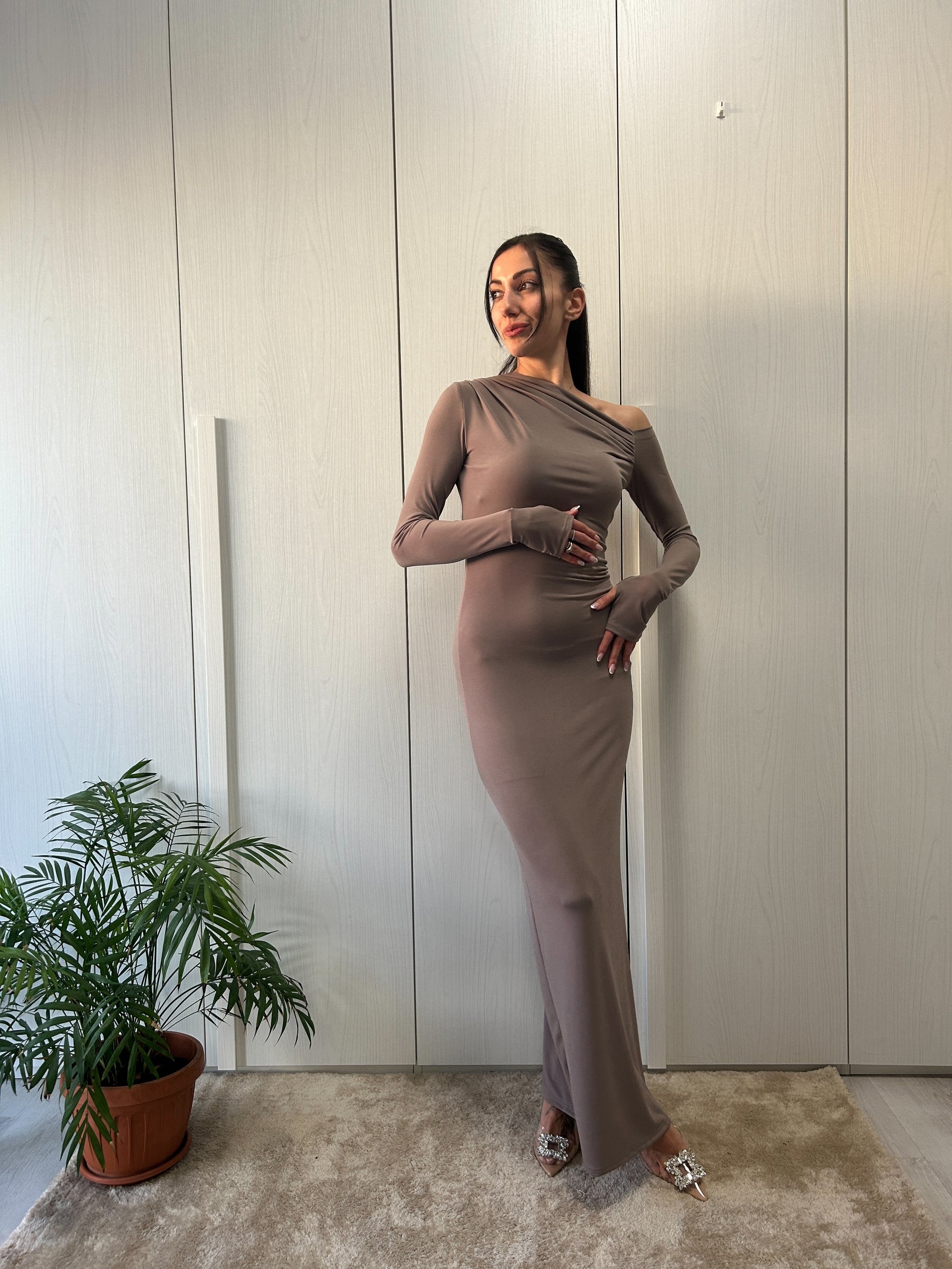 Vestito loungette nero con scollo asimmetrico e maniche lunghe
